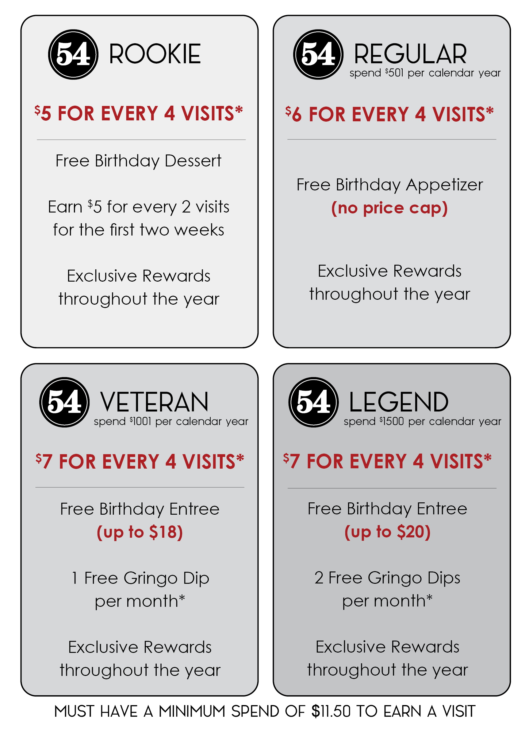 Five Four Rewards is here and is FREE TO JOIN! Members of the Five Four Rewards Program can earn rewards by presenting either their 54th Street Mobile App, VISIT code OR their PHONE NUMBER when purchasing food and beverages (alcoholic and non-alcoholic*) at participating 54th Street/Five Four locations. By spending more, you can move through tiers to earn better rewards!