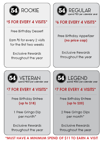 Five Four Rewards is here and is FREE TO JOIN! Members of the Five Four Rewards Program can earn rewards by presenting either their 54th Street Mobile App, VISIT code OR their PHONE NUMBER when purchasing food and beverages (alcoholic and non-alcoholic*) at participating 54th Street/Five Four locations. By spending more, you can move through tiers to earn better rewards!